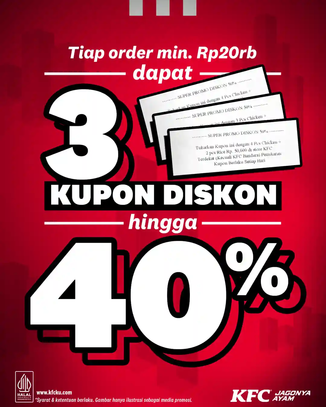 Promo Bounce Back ini berlaku untuk semua pembelian minimal Rp20.000 di gerai KFC Indonesia. Setelah melakukan transaksi, pelanggan akan langsung menerima tiga kupon diskon yang tercetak di struk pembelian.